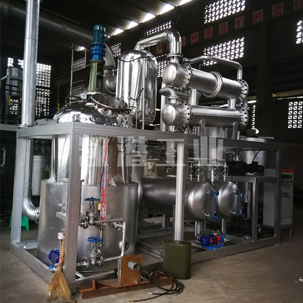 3.1 采用高真空刮膜蒸發器,分離程度高,遠高于傳統蒸餾器。普通的蒸發器在300℃的時候就開始碳化結焦,導致回收的油品質量明顯下降,且回收率也明顯降低。因廢機油里的膠質,瀝青,游離碳等雜質非常多,所以采用高真空刮膜蒸發器可有效的防止這些物質結焦,有效保障設備長期運行的同時還能提高廢油產量。